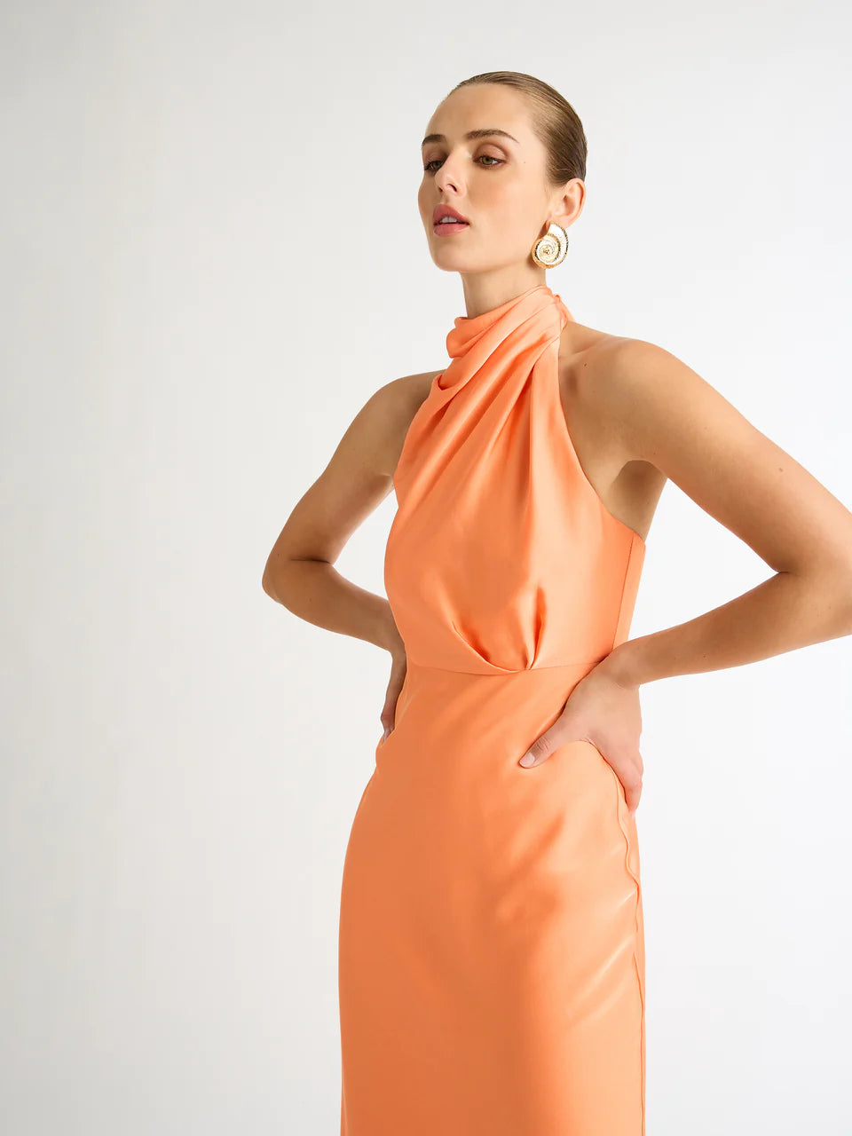 Embrace timeless elegance with the Jasmine Midi Dress. This luxurious satin piece features a flattering cowl neckline and a flowing midi skirt, perfect for both formal occasions and stylish evenings out. Adjustable halter straps ensure a comfortable fit.