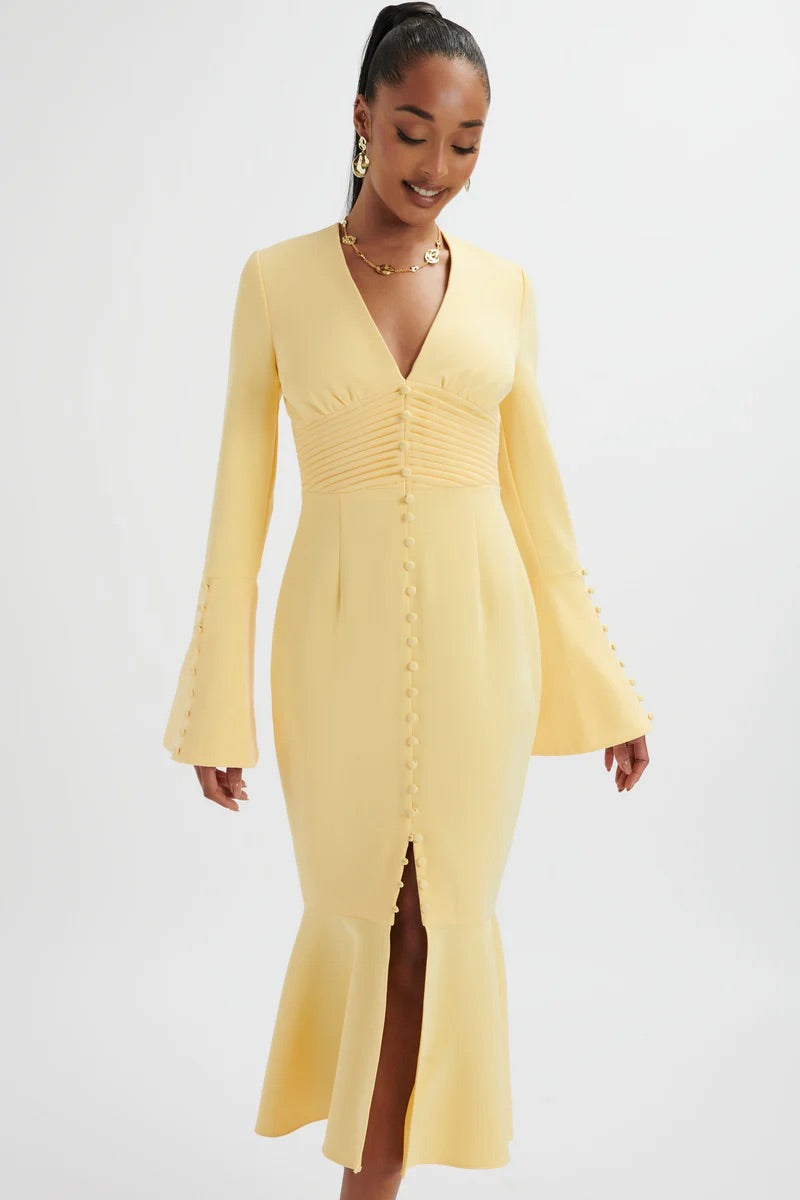 This Salma midi dress is crafted from premium crepe in a soft pastel yellow shade. Designed with a fit and flare silhouette and fishtail hem, the dress flatters the figure with a pleated waistband, under bust gathers, and waist darts. Delicate micro button detailing with fit and flute sleeves add a touch of elegance. Perfect for wedding guest dressing or Ladies Day.