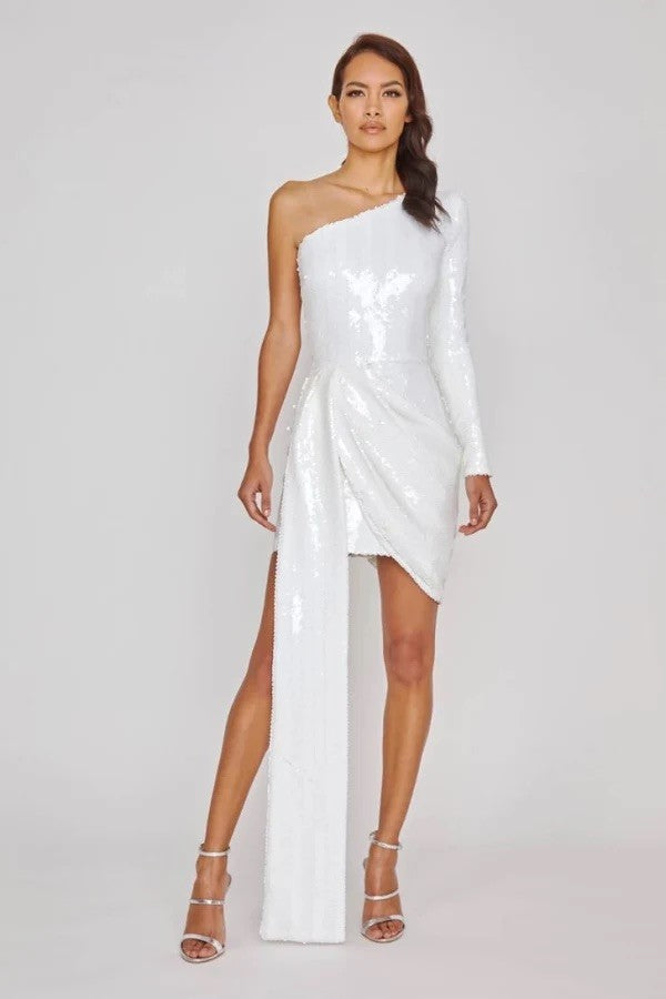 The Nadine Merabi Celina White Dress has a structured one-shoulder design, asymmetric floor-sweeping drape and a silhouette crafted from white sequins.