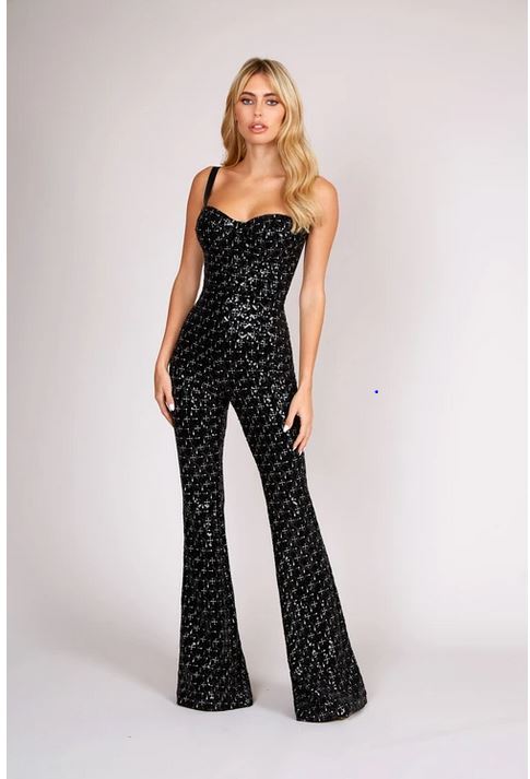 HAILEY is the perfect piece for those daring to make a statement. A figure-hugging jumpsuit complete with a flared trouser. The perfect one-piece for party season. Crafted from shimmering velvet fabric covered in delicate, hand embroidered sequins and metallic thread embroidery. A fully detailed piece which creates a high impact look, complete with an underwire bust to give structure and compliment your shape.