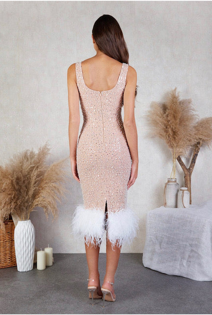 Lulu is a beautiful beaded dress with a square neckline and feather hemline, and is the perfect party dress for your wedding celebrations. Dance the night away and feel amazing in this show stopper.
