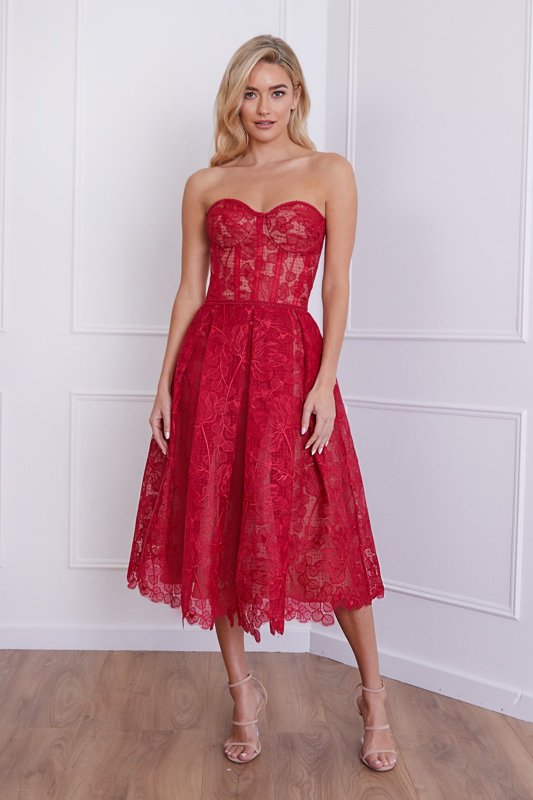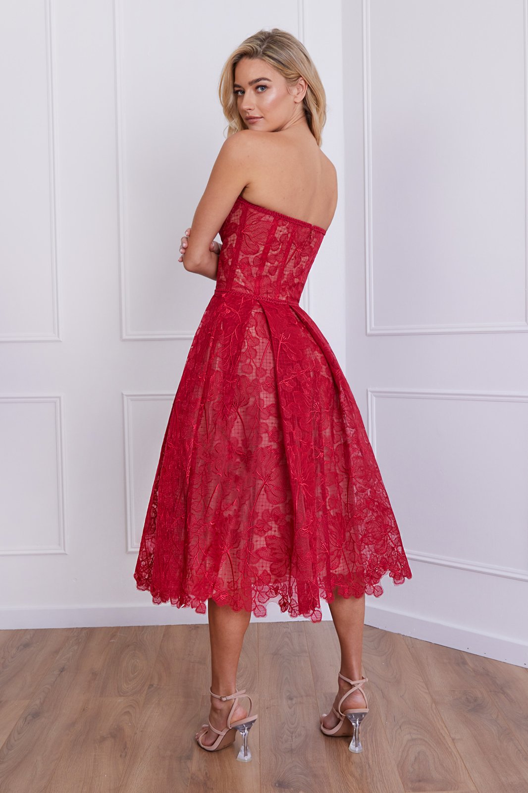 This beautiful, elegant style with embroidered flowers features a perfectly fitted bodice top with inner cups and an underwire so it will stay in place all day. The full skirt is pleated, extends from the waist and stops below the knee.
