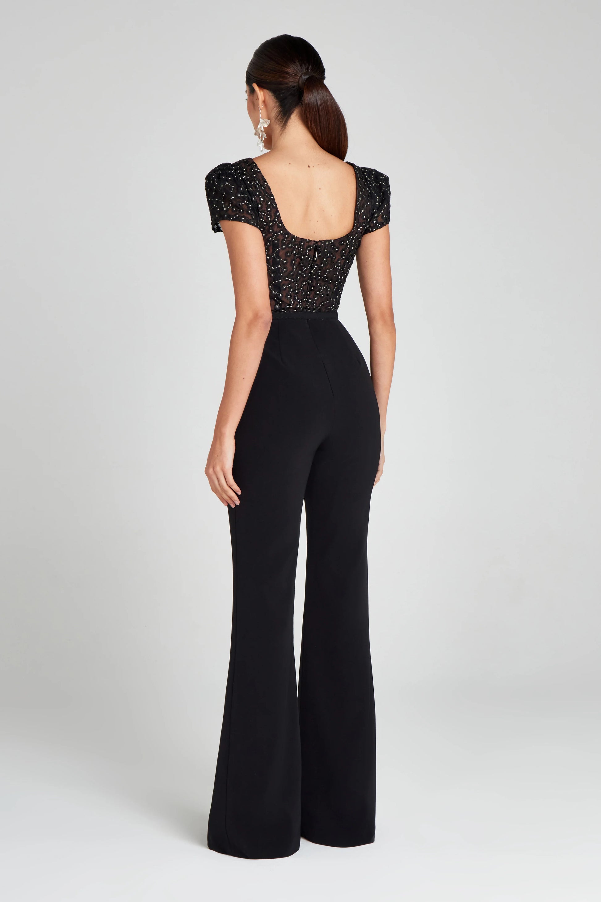 TAMARA is an elegant jumpsuit featuring a floral embroidered sheer black fabrication with embroidered white flowers that have a touch of gold thread running through. The jumpsuit has romantic puff sleeves which are unlined and corset boning to the front, back, and sides of the bodice while being fully lined in nude for your comfort. This style's sweetheart neckline with corset cups is finished with a black crepe-flared trouser, fully lined for a smooth and comfortable fit, to complement your shape. This piece is completed with a detachable black crepe belt and a zip to the back for a sleek finish.
