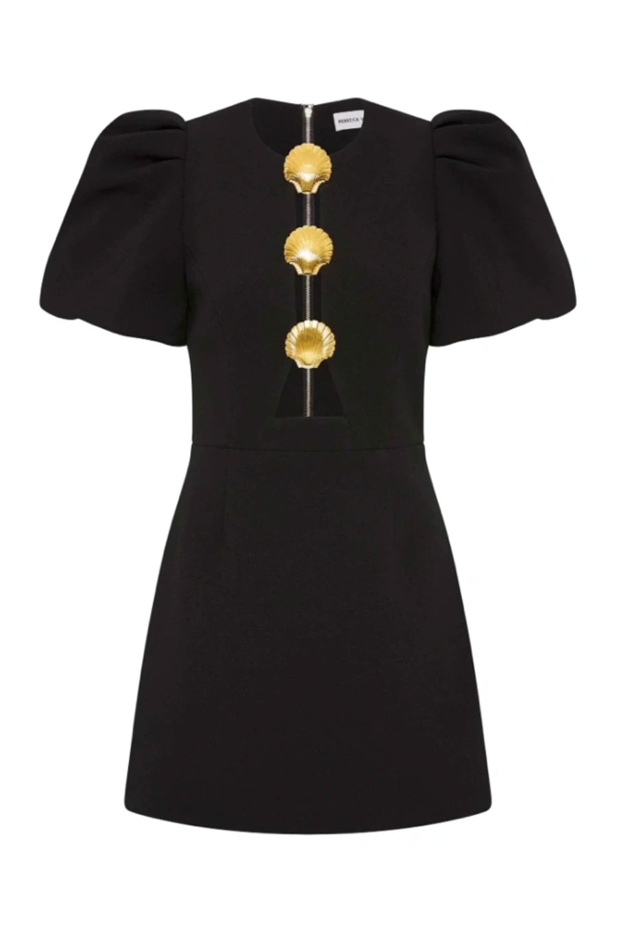 It features an elegant rounded neckline, voluminous puff short sleeves, and is adorned with gold shell details between cut outs on the front of the fitted bodice.