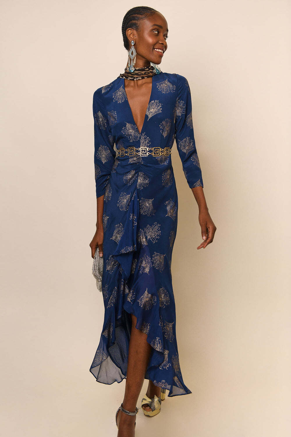 Shaped with a sculpting ruched bodice and a gorgeous, ruffled drape, Rixo’s Rose midi dress is the epitome of timeless glamour. It’s made from pure silk with sparkling glittered stars throughout (belt not included)