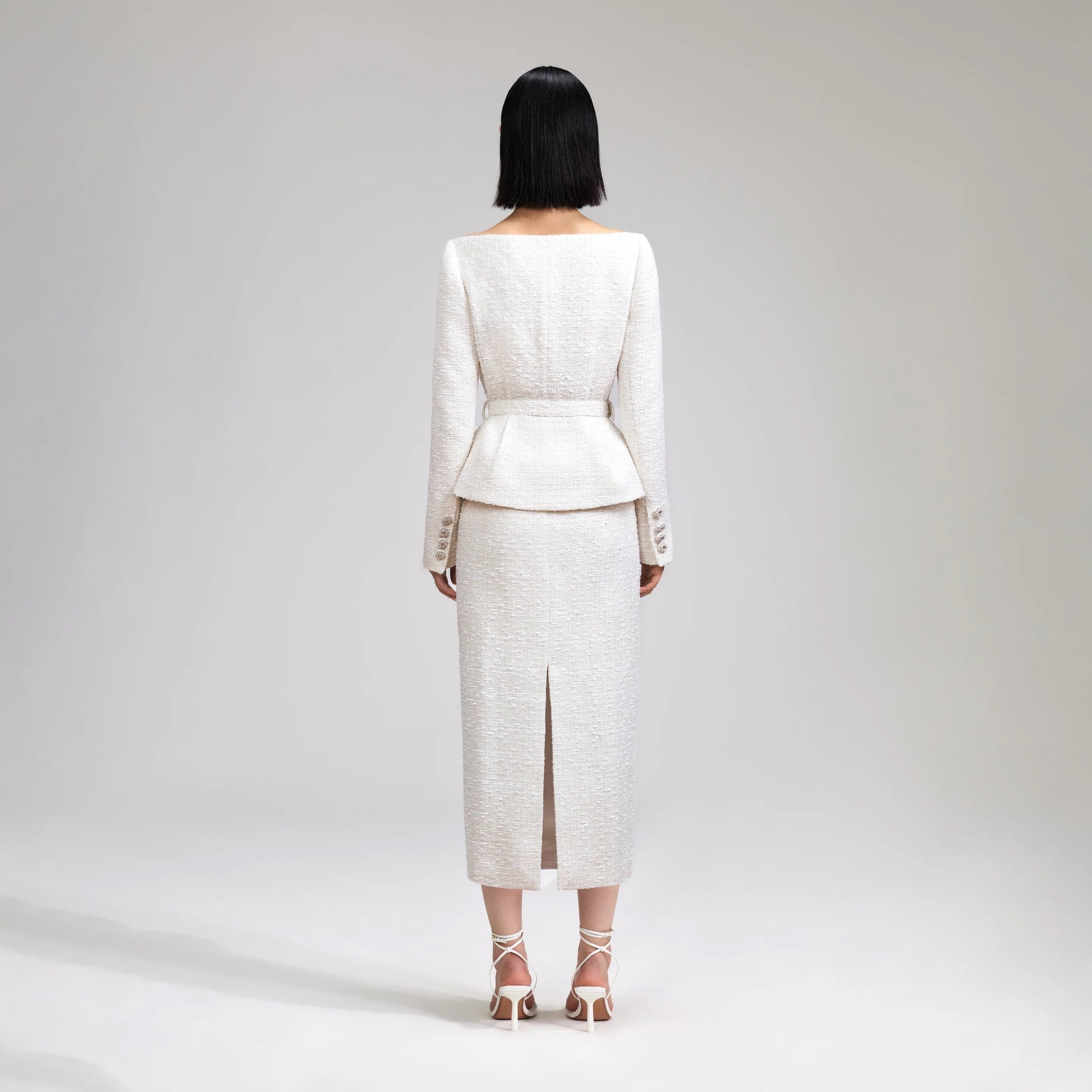 Crafted with cream bouclé for its satisfying structure and rich feel, this dress puts an elegant spin on hallmarks of classic tailoring.