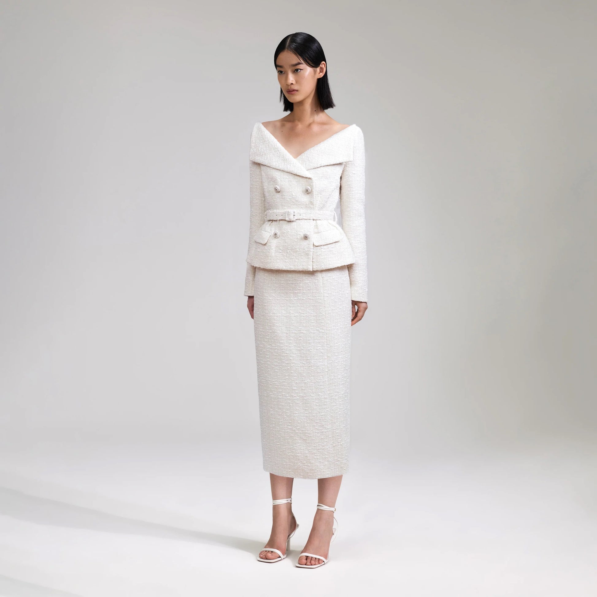 Its double-breasted bodice is framed by a flattering open shoulder neckline and waist-cinching belt, and falls to a split midi skirt for ease of movement
