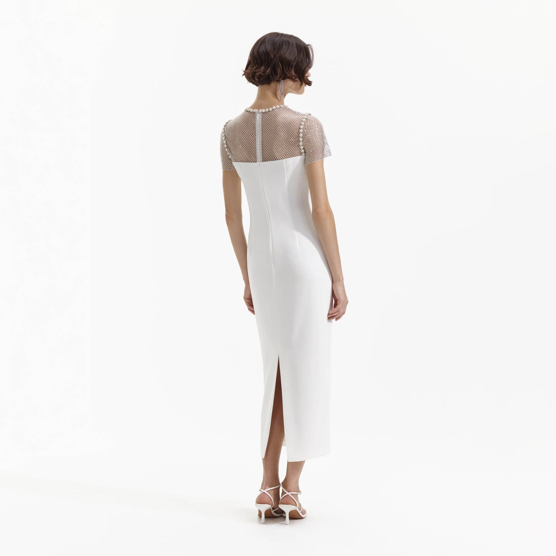 Its bow-inspired bodice is framed by rhinestone-studded mesh, diamanté trim and a cut-out, and falls to a sleek, calf-skimming skirt for a statuesque silhouette.