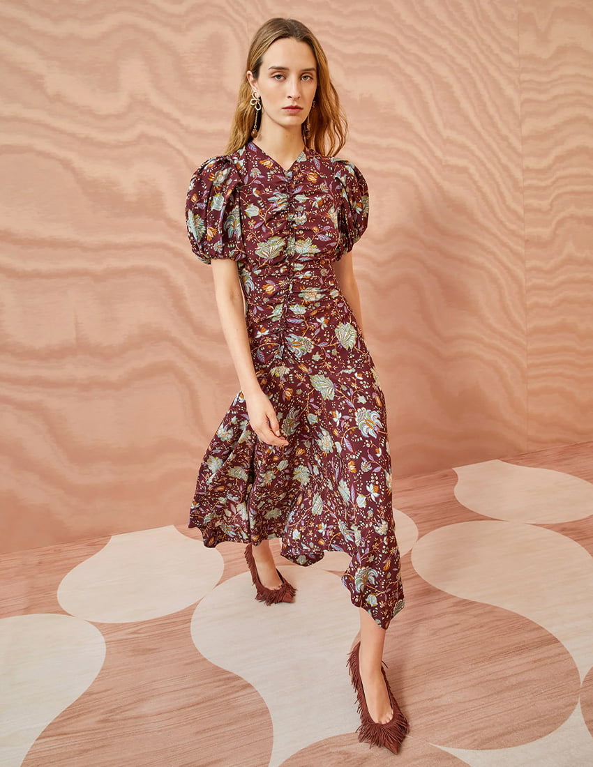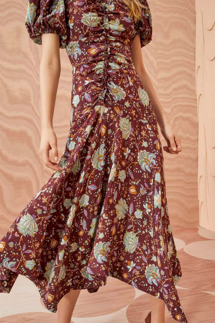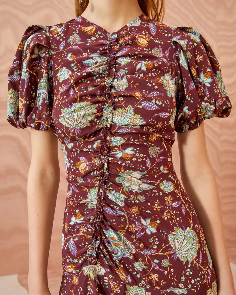 This Ulla Johnson Heleen floral print silk midi dress is patterned throughout with intricate botanical motifs. Cut with a V-shaped neckline, it's framed by voluminous sleeves and ruched along the bodice.